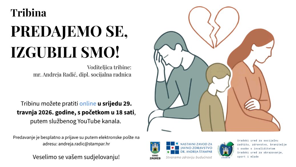 Služba za mentalno zdravlje i prevenciju ovisnosti Nastavnog zavoda za javno zdravstvo „Dr. Andrija Štampar“ organizira tribinu za roditelje pod nazivom “Predajemo se, izgubili smo!”